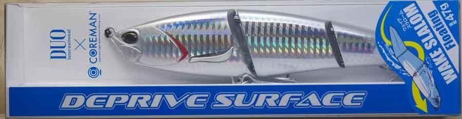 170mm/47g フローティング! ■フック #2 DUO×COREMAN共同開発のシーバスビックベイト!デプライブは、独自の連結機構による2ジョイントボディが生み出す艶めかしいS字アクションに、絶妙な間を織り交ぜたシーバス専用設計!ストレスのないキャスティング性能で、普段のシーバスゲームにアジャスト。このデプライブにサーフェイスレンジ攻略に特化させたフローティングタイプが新たにラインナップ。生命感溢れるアクションとボディのネジレにより発生する引き波で、表層を意識したシーバスに抜群の効果を発揮。瀕死のベイトを演出するドリフト釣法は前提としたルアーウエイトを設定。 抜群の飛距離を誇りながらも、持ち重りやテーリングなどのストレスを軽減するボディデザイン。 淡水、海水共に高速巻きにも対応するウエイトバランス。 独自の連結機構でボディに若干のネジレを発生させるジョイント部は、リトリーブ時にジョイント面に水流が当たる事でスムーズなど立ち上がりとしっかりした巻き心地を実現。 DUOホームページ